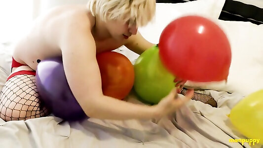 Fleshy Crossdresser Toying With Balloons In A Ruffle Dress